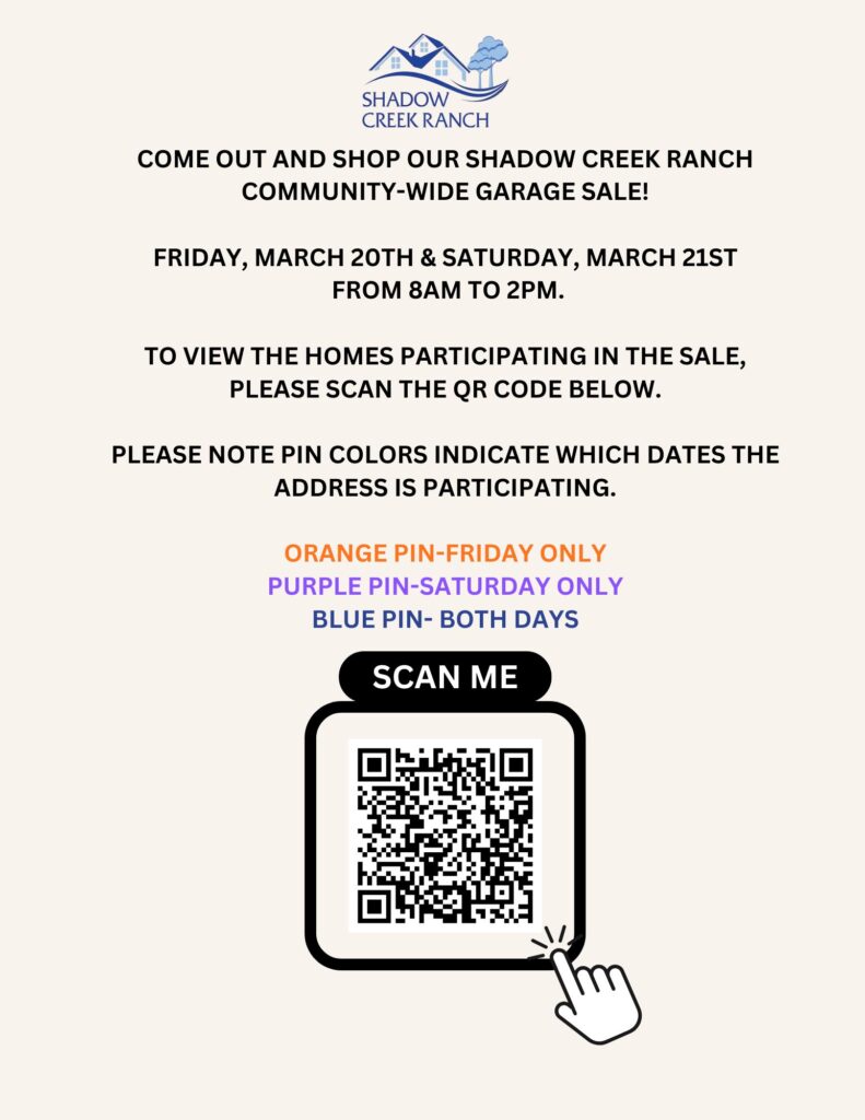 To participate, you must submit the Garage Sale Application as required by the City for a permit no later than March 5th by 5pm to garagesale@shadowcreekranchhoa.com.