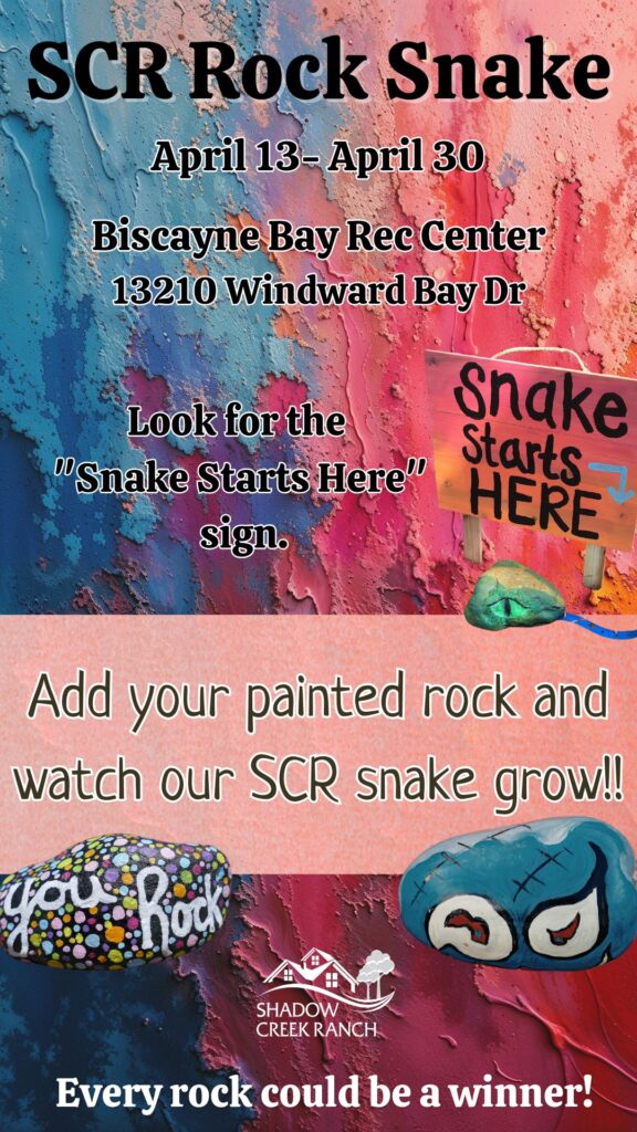Get creative and join our community art project! Head over to the Biscayne Bay Recreation Center (13210 Windward Bay Dr.) between April 13th and April 30th to add your masterpiece to the snake.