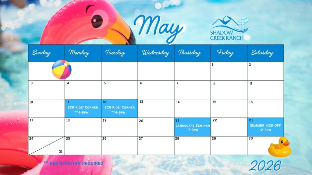 Welcome to Shadow Creek Ranch Homeowners Association. This site was created as a communications tool for the residents of Shadow Creek Ranch. You will find announcements, contact forms and phone numbers, pool, clubhouse and other amenity hours and rules, our local school information, event information and calendars, a library of Association related documents and much more.We invite you to browse the site and if you don’t see something that you think should be included, please contact us! |