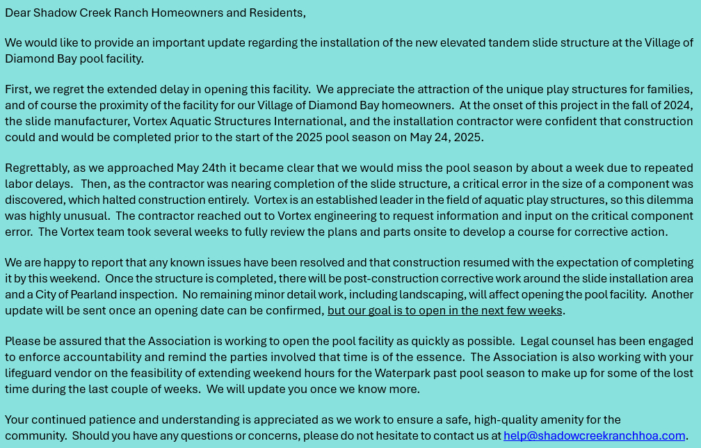 Get ready to make a splash! The Shadow Creek Ranch HOA is thrilled to announce the Diamond Bay Waterpark, 2034 Trinity Bay Dr., Pearland, TX 77584, Grand Opening Celebration on Saturday, July 19, 2025, from 12:00 PM to 3:00 PM!